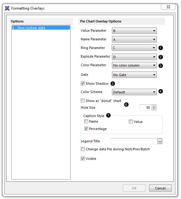Pie Charts in FCS Express are fully formattable. In addition to many of the formatting options shared by all plots (border, size, background, titles, and legend), special formatting options are accessible from the Overlays category. To access these special options: