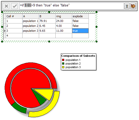 3. | enter the value of the rule for each row (each row corresponds to an individual bar). The rule must be a formula evaluating to "TRUE" or "FALSE"; if "TRUE," the sector (slice) will explode away from the pie. An example of an Explode rule containing a token is shown below: |