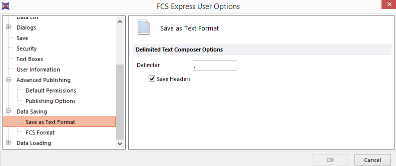 There are two subcategories of Data Saving FCS Express User Options: Save as Text Format and FCS Format.